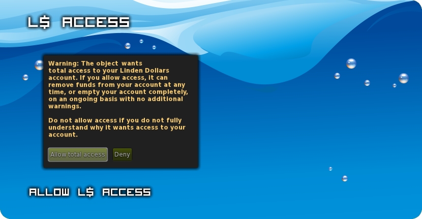 Buoy requires to take L$ permission for funding. Please grant L$ permission. The buoys never take L$ from your account until you decide to increase buoy budget.